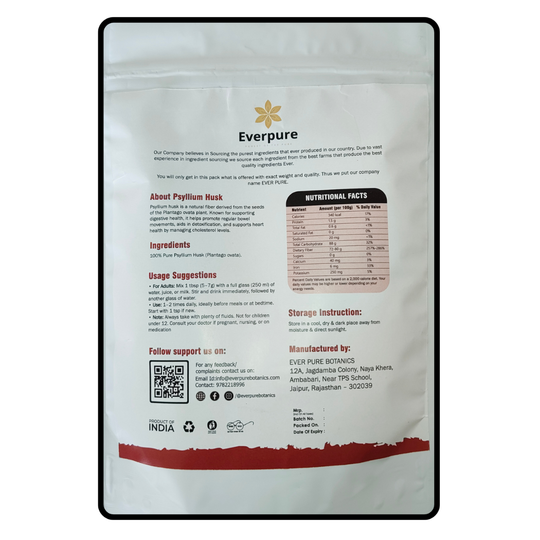 Pure and Natural Psyllium Husk is a premium dietary fiber supplement made from 100% natural sources. Rich in soluble fiber, it supports healthy digestion, promotes regular bowel movements, and aids in maintaining overall gut health. This gluten‑free and chemical‑free psyllium husk is an ideal choice for those seeking a natural way to improve digestive wellness, manage weight, and support heart health. Perfect for mixing into water, smoothies, or meals for daily use.